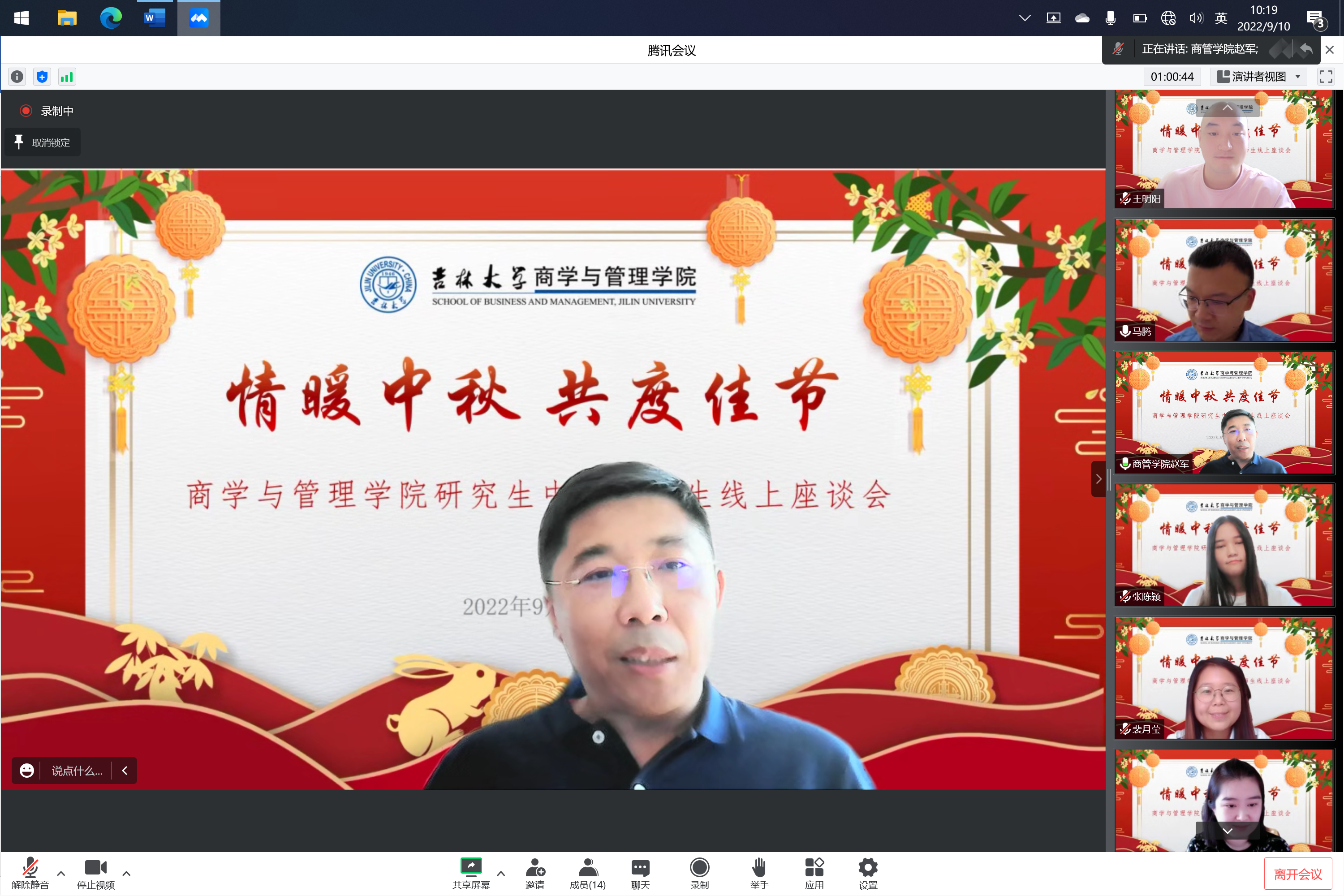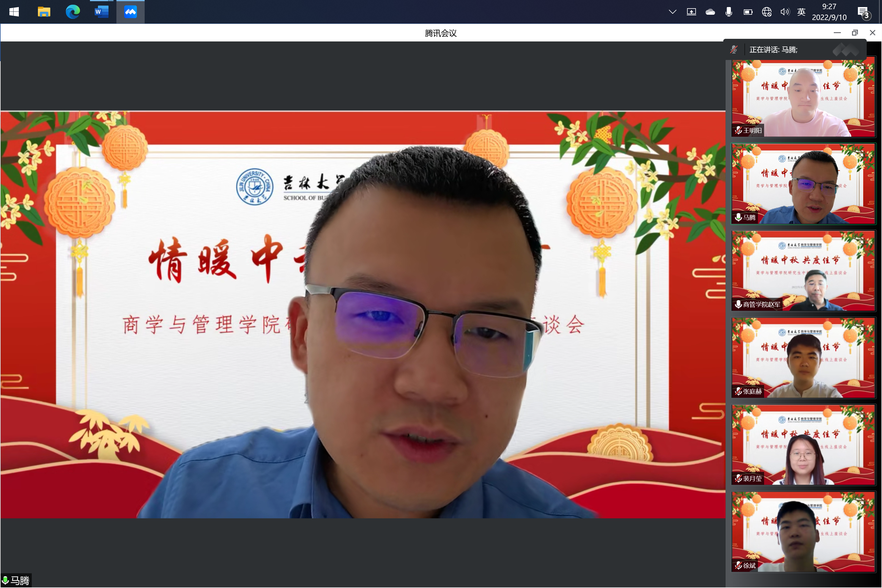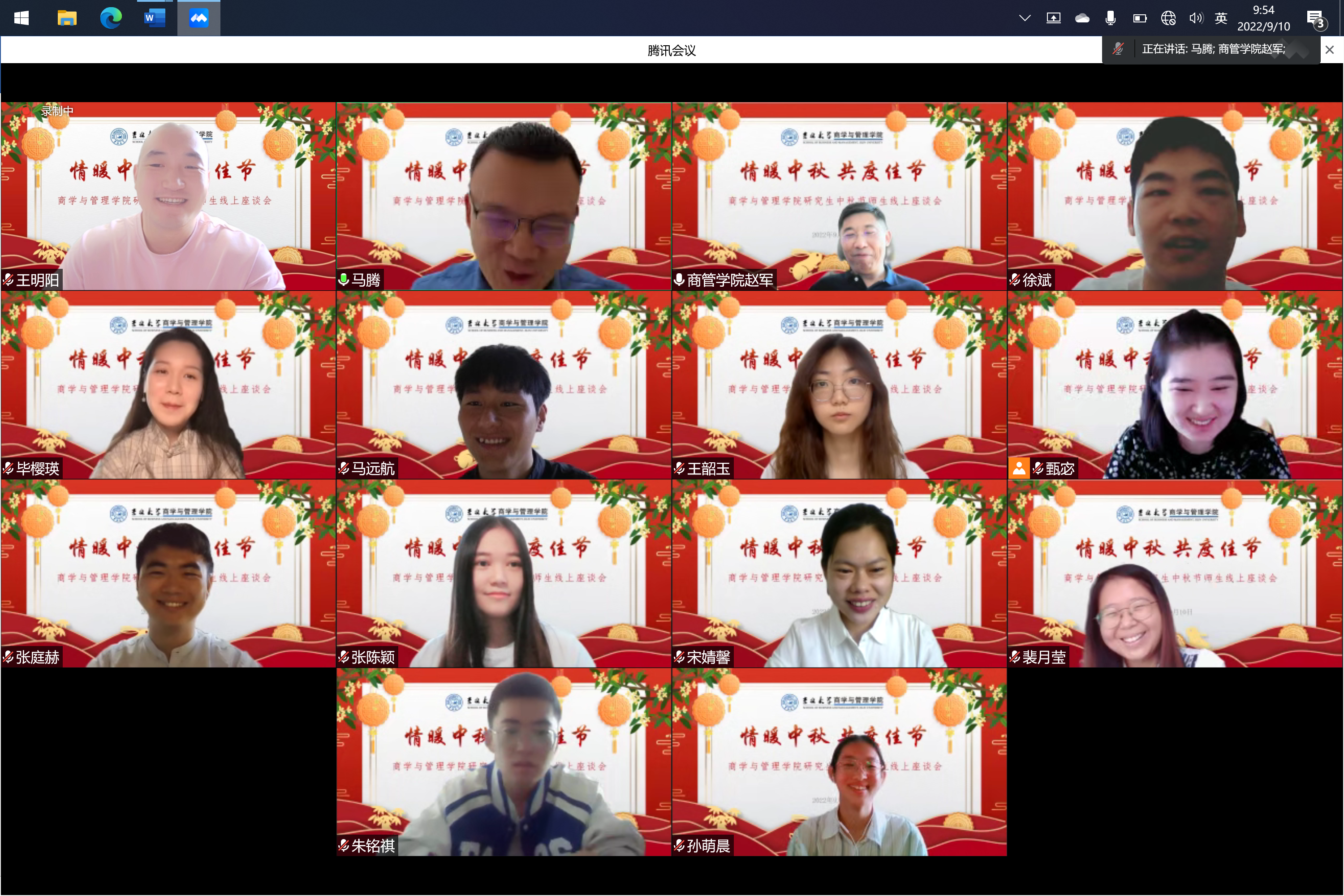 丹桂飘香,秋风送爽。为庆祝第38个教师节及传统中秋佳节,9月10日上午,商学与管理学院开展了“情暖中秋、共度佳节”研究生师生线上座谈会。商学与管理学院党委书记赵军,党委副书记马腾,研究生管理办公室主任甄宓,研究生辅导员裴月莹及多名研究生学生代表出席本次会议。
