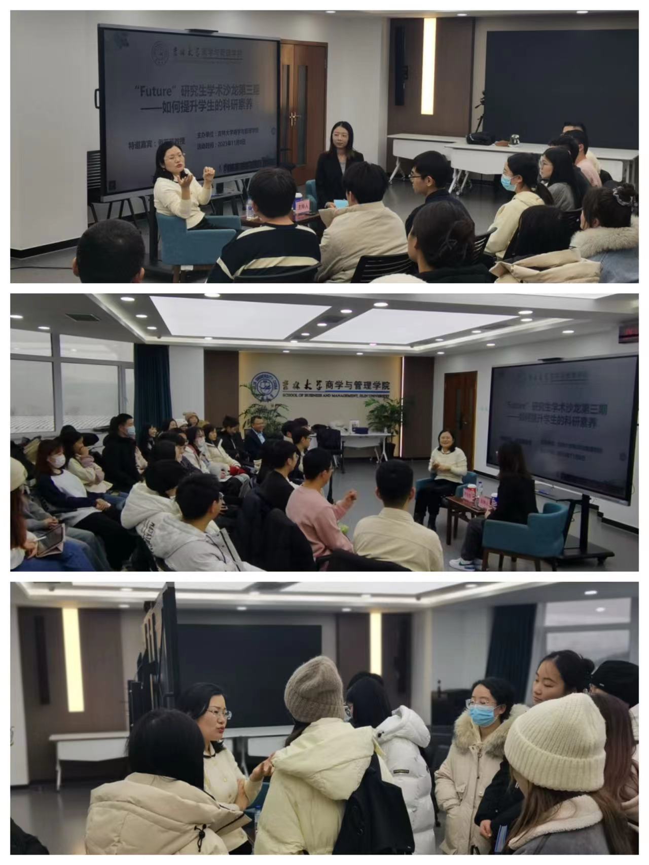 为更好地促进学术交流与科研创新,培养研究生同学们的学术兴趣,11月8日下午,商学与管理学院研究生会于东荣大厦A506开展了“Future”研究生学术沙龙第三期活动。本期学术沙龙邀请到了吉林大学“匡亚明学者”领军教授B岗、商学与管理系学院技术经济系教授、博士生导师尹苗苗老师作为主讲嘉宾,围绕“如何提升学生的科研素养”与同学们展开讨论与分享。商学与管理学院党委副书记马腾老师也一同参加了本次活动。