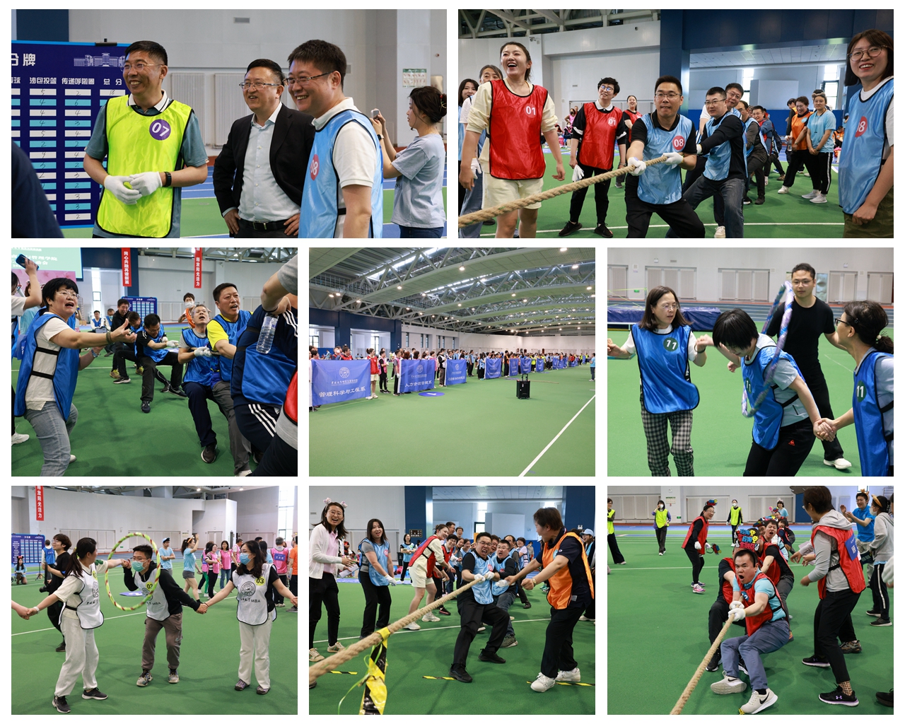 运动会设置了“力拔山河—拔河比赛”“争分夺秒—纸杯传球”“百发百中—沙包掷准”“一圈到底—传递呼啦圈”“勇往直前-跳绳接力”等五个项目,这些趣味性和体能素质均具有高度挑战性的项目使教职工们充分展现出了运动才华和团队精神。学院13个教学系代表队斗志昂扬,赛场上大家彼此了解、互相合作,让运动会成为了一次真正意义上的心灵融合之旅。随着校党委常委、副校长兼商学与管理学院院长蔡立东教授吹响拔河比赛决赛的哨声,运动场内的“加油”声山呼海啸、震耳欲聋,赛场上的运动员拼尽全力,赛场下的老师们热情高涨、激情满怀……这一刻,所有的老师都在为彼此努力,一声声的呐喊,镌刻下了这一时刻的共同记忆。