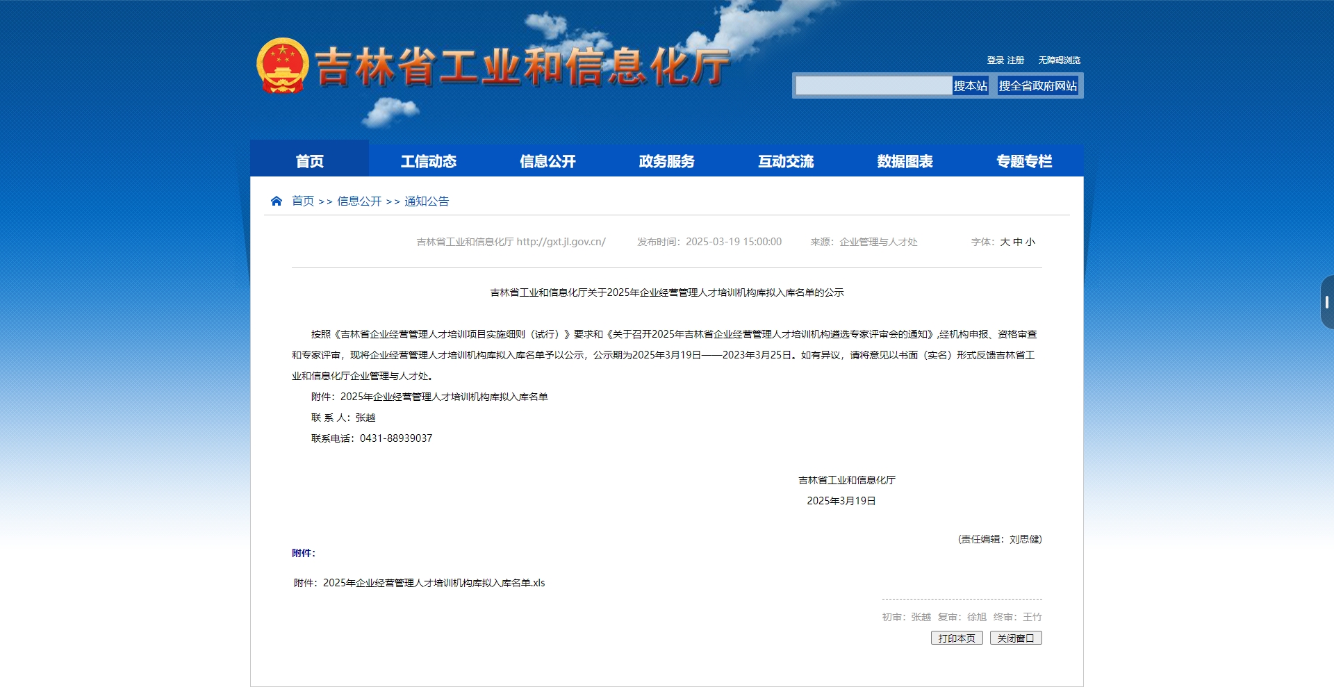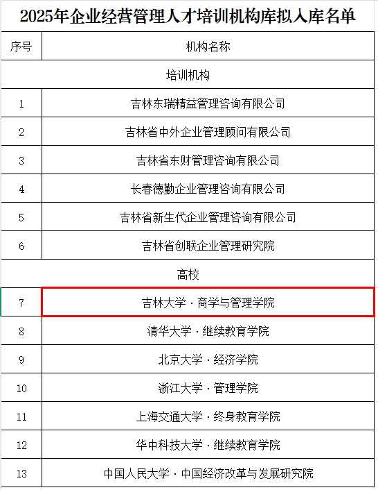 近日,吉林省工业和信息化厅发布了2025年企业经营管理人才培训机构库拟入库名单,吉林大学商学与管理学院凭借雄厚的师资力量、丰富的教学资源和卓越的培训成果,成功入选。