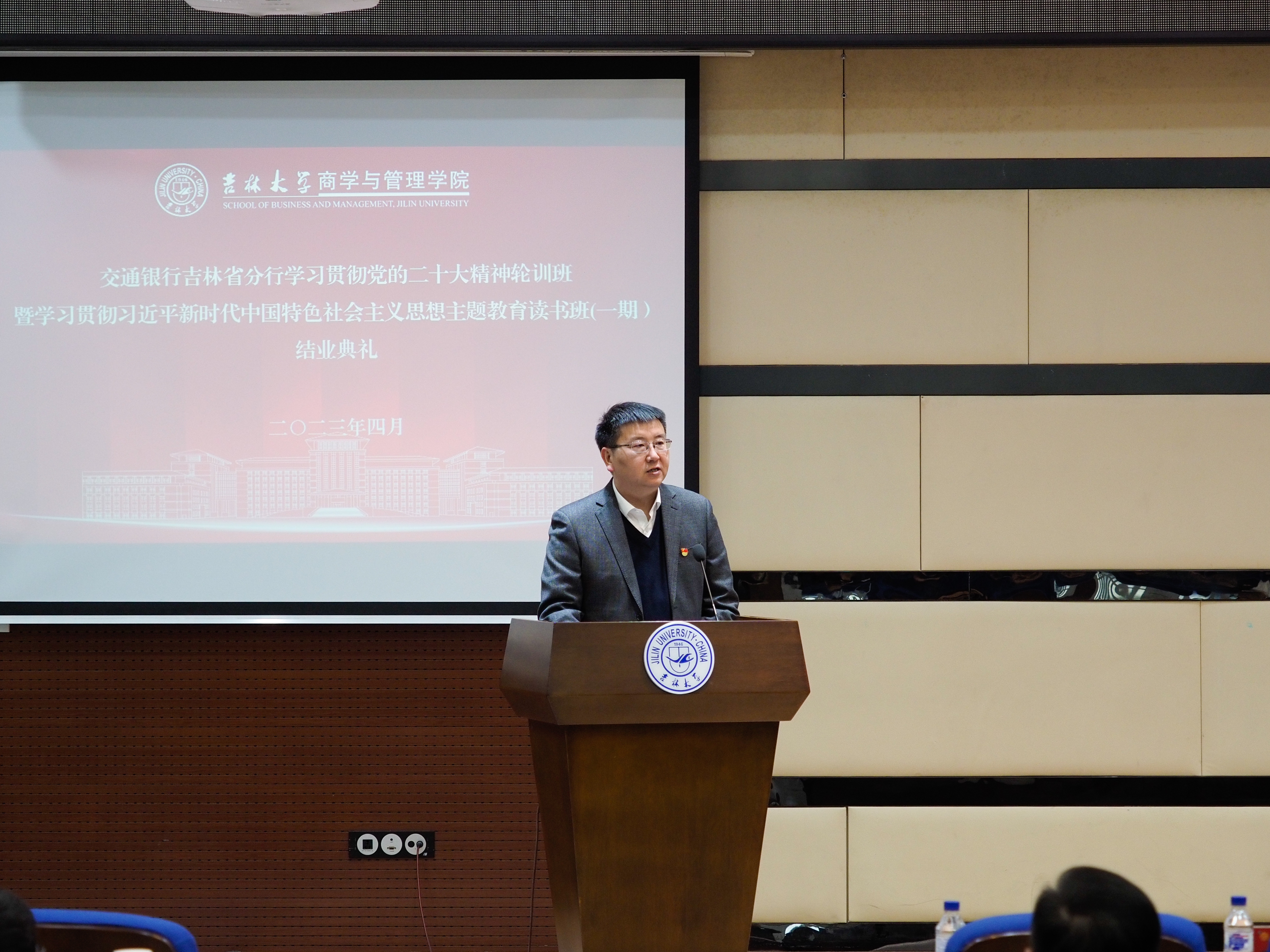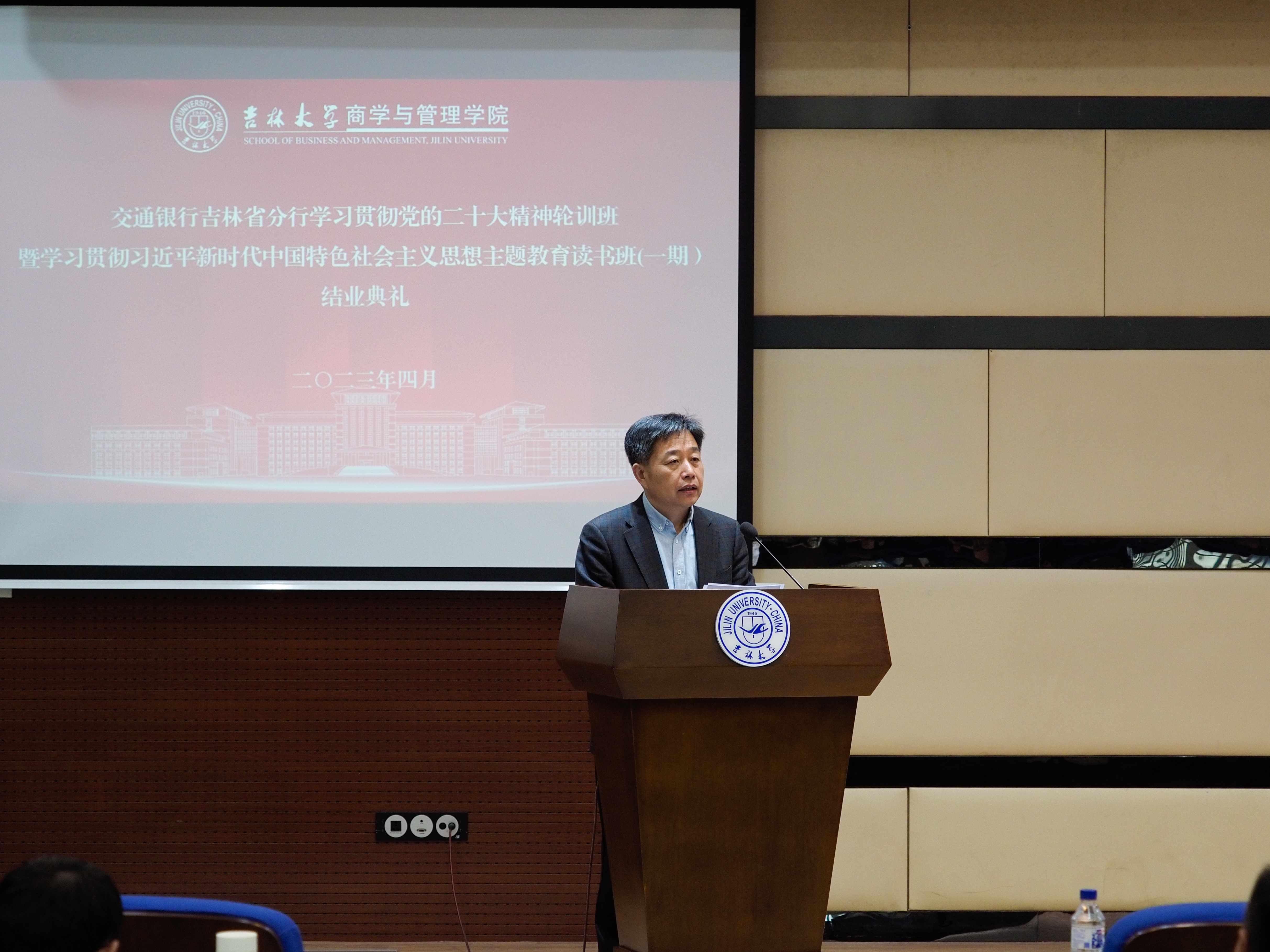商管学院副院长辛本禄教授在讲话中表示,始建于1908年的交通银行,是中国历史最悠久的银行之一,也是中国第一家全国性的国有股份制商业银行。多年以来,交通银行吉林省分行长期关注、支持吉林大学和学院的发展,也是我校重要的战略合作伙伴。交通银行的领导,在“疫情”结束后的第一年,就将举办“吉林省分行助理及以上管理干部学习贯彻党的二十大精神集中轮训班和主题教育读书班”的光荣任务委托我院,这是对吉林大学的充分信任,也是对商学与管理学院办学实力的认可。吉林大学作为国家“双一流建设高校”,作为知识传播、教书育人、为国家培养高端人才的重要阵地,始终心怀“国之大者”,致力于发挥高等学校特有的科技高地、人才高地优势,以勇担社会责任、服务国家战略、赋能地方经济社会发展为天职,愿意为我们的友好伙伴,服务交通银行“创造共同价值”的使命,提供最优质的教学服务,全面提升合作层次,不断深化合作内涵,与交通银行一道行稳致远,共同构建合作共赢、共同发展的命运共同体。