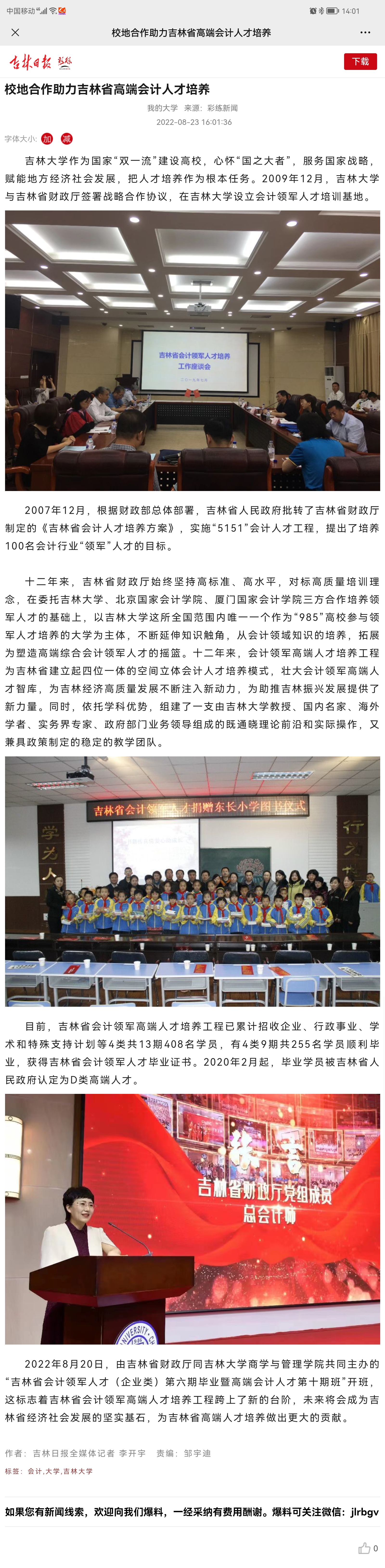 吉林大学作为国家“双一流”建设高校,心怀“国之大者”,服务国家战略,赋能地方经济社会发展,把人才培养作为根本任务。2009年12月,吉林大学与吉林省财政厅签署战略合作协议,在吉林大学设立会计领军人才培训基地。